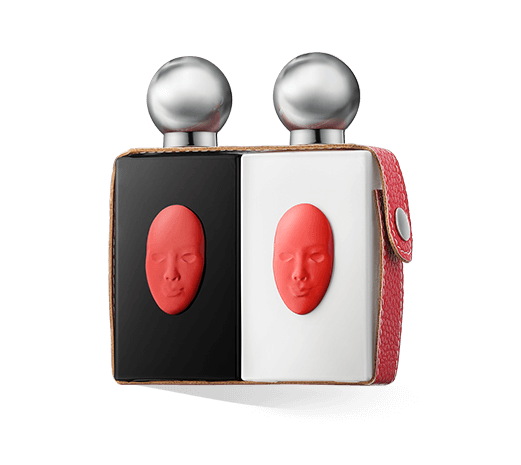 Die Flakons von Delfy Cosmetics Duo Elegance halten uns den Dualismus deutlich vor Augen. Ein Flakon ist strahlend weiß, der andere glänzend schwarz. Die Form ist jeweils ein glatter, vertikaler Quader. Gemeinsam ergeben sie ein Quadrat. Auf beiden Flakons sehen wir ein Gesicht, das leuchtend rot aus dem Glas zu kommen scheint. Rot, Farbe des Lebens und der Liebe, verbindet das Helle und das Dunkle. Ein rotes Lederband umschließt beide Flakons und ist mit einem Druckknopf befestigt. Die großen, kugelförmigen Kappen in Silber neutralisieren die kräftigen Farben.