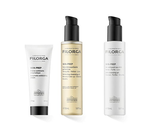 Filorga Skin-Prep bietet fünf Möglichkeiten, die Haut von abgestorbenen Zellen, Schmutz, Talg und Make-up zu befreien und gleichzeitig das Hautbild zu verbessern. Das leichte Mizellenwasser Micellar Solution reinigt die Haut und versorgt sie mit Feuchtigkeit. Das AHA Cleansing Gel ist ein feines Gel, das besonders hauterneuernd, feuchtigkeitsspendend und ausgleichend wirkt. Der Enzymatic Cleansig Foam reinigt die Haut auf enzymatischer Basis. Auf die gleiche Weise wirkt das Peeling Enzymatic Exfoliating Cream. Das nährende Perfecting Cleansing Oil reinigt die Haut und versorgt sie mit wichtigen Fettsäuren für einen zarten Teint. Alle Produkte beschleunigen die Hauterneuerung und tragen so zu einem ausgeglichenen, feineren Hautbild bei.