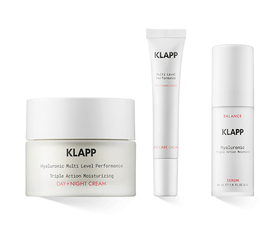 Bei regelmäßiger Anwendung der aufeinander abgestimmten Produkte aus der Serie KLAPP Hyaluronic Multi Level Performance werden der Hyaluronsäure- und Feuchtigkeitsgehalt der Haut gesteigert. Der Teint erhält ein frisches Strahlen, Konturen erscheinen markanter und betonter. Die Intensität der Pflege lässt sich durch Serum, Creme, Gel und Booster optimal auf den individuellen Bedarf abstimmen.