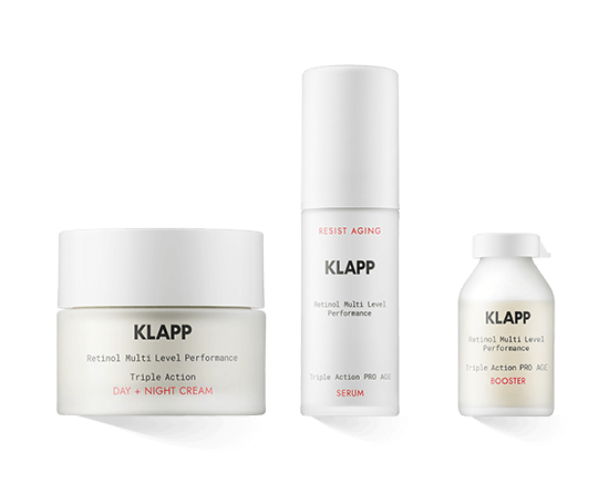 Die KLAPP Resist Aging Retinol Pflegeserie umfass drei Produkte, welche das Hautbild langfristig verbessern. Das Triple Action PRO AGE Serum wird vor der Tages- bzw. Nachtcreme aufgetragen. Es verbessert den Feuchtigkeitsgehalt der Haut und verleiht dem Teint einen jugendlichen Glow.