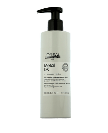Das L'Oréal Professionnel Serie Expert Metal DX Professional Pre-Shampoo schützt das Haar gezielt vor unsichtbaren Metallablagerungen, wie beispielsweise Kupfer, die sich mit jeder Haarwäsche in der Faser anreichern. Diese können Haarbruch und unerwünschte Farbreflexe begünstigen, insbesondere bei porösem Haar. Die innovative Anti-Porositäts-Technologie mit zwei Prozent Glicofiller und patentiertem Glicoamin neutralisiert Metalle tief im Haarinneren und füllt Mikrorisse an der Oberfläche auf. So wird die Haarfaser gestärkt und optimal auf die anschließende Pflege vorbereitet.