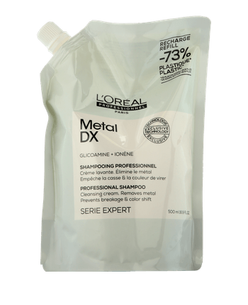 Das L'Oréal Professionnel Serie Expert Metal DX Professional Shampoo ist ein farberhaltendes und stärkendes Shampoo für farbbehandeltes, coloriertes sowie Balayage-behandeltes Haar. Mit Glicoamin hilft es, Metallablagerungen im Haar zu entfernen. Dies können die Farbe verändern, schneller verblassen lassen oder das Haar brüchiger machen. Das Shampoo verleiht mehr Volumen und Sprungkraft für ein langhaltend schönes Colorationsergebnis. Mit dem Refill lässt sich die Flasche neu befüllen.
