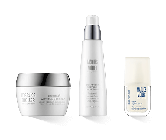 Die exklusive Marlies Möller Pashmisilk Linie vereint zahlreiche Styling- und Pflegeaspekte. Hier wird das Haar durch Shampoos, Spülungen, Kuren und mehr verwöhnt, belebt und nachhaltig geschützt: beim Styling, aber auch im Alltag.