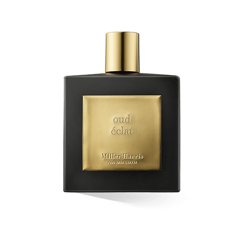 Die Werbung für Miller Harris Oud Éclat zeigt den Flakon oft in Kombination mit großen Kristallen, die in einem Licht schimmern, das an einen Sonnenuntergang erinnert. So wirkt auch das schwarz-goldene Design des Flakons wärmer als bei Tageslicht. Das Schwarz erhält eine samtige Tiefe, das Gold scheint zu glühen. Dies spiegelt die kunstvolle Komposition von Oud Éclat wider, deren helle, fast durchscheinende Noten gerade durch die dunklen Düfte von Oud, Ambrette, Moschus und Kaschmirholz betont werden. Gleichzeitig erinnern die funkelnden Steine an den Schatz, den dieses Parfum in sich trägt.