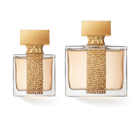 Für den Flakon von M.Micallef Royal Muska hat Martine Micallef die Farbe Gold als Hauptthema gewählt. Der an sich transparente Glasflakon erhält durch ein goldenes Band aus Glassteinen in der Mitte der Front ein stark strukturierendes Element, das an ein goldenes Armband erinnert und damit auf die Eleganz des Duftes anspielt. Der Hals des Flakons ist ebenfalls in der schimmernden Farbe gehalten und zeigt eine lebhafte Strukturierung. Die Verschlusskappe ist wie der Flakon ein glatter Quader, der an der Oberseite und den Seitenflächen ebenfalls eine strukturierte Oberfläche aufweist. Das Design drückt puren Luxus aus, stellt organische Strukturen in Kontrast zu glatten Oberflächen und wirkt dadurch äußerst spannend. Der luxuriöse Duft verbindet das weiche Grundthema Moschus mit lebendigen Noten von Blumen, Früchten und Hölzern. So erzeugt der Duft die gleiche Spannung wie die abwechslungsreiche Gestaltung des Flakons, die jedoch durch den hellen Moschus in Balance gehalten wird.