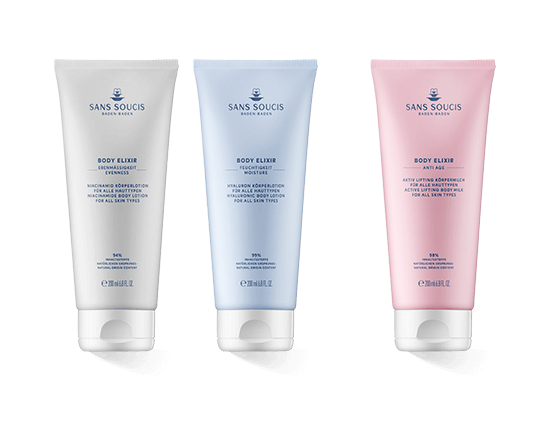 Sans Soucis Body Elixir verwöhnt die Haut mit wohltuenden Inhaltsstoffen, die je nach Produkt eine ganz spezifische Wirkung haben. Dabei zielen die Produkte auf eine intensive und hauttypgerechte Pflege ab. Das Ergebnis ist eine glatte, entspannte und gut genährte Haut.