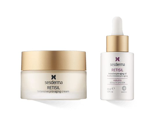 Die Sesderma Retisil Pflegeserie ist der perfekte Partner für die tägliche Pflege reiferer Haut. Eine hervorragende Basis bildet die Intensive Pro-Aging Cream. Die reichhaltige Creme hat eine intensiv straffende und faltenreduzierende Wirkung, sie lässt feine Linien und Flecken sichtbar und langanhaltend verschwinden, ebnet den Teint und verbessert das Hautbild von Gesicht, Hals und Dekolleté. Die sensible Haut der Augenpartie und der Lippenkontur erfährt wiederum mit der Eye and Lip Pro-Aging Contour Creme intensive Pflege. Die leichte Creme glättet feine Fältchen um Augen und Mund, hydratisiert, mildert Tränensäcke und hellt dunkle Augenringe sichtbar auf. Für einen wachen, frischen Blick und ein fröhliches Lächeln. Eine Extraportion Pflege versprechen das Intensive Pro-Aging Serum und das Intensive Pro-Aging Oil. Beide regen die Kollagensynthese an und sorgen so für eine straffere, glattere und elastischere Haut. Sie gleichen den Hautton aus, lassen Hautunreinheiten verschwinden und verbessern die Feuchtigkeitsversorgung der Haut. Zudem verleihen sie eine tolle Ausstrahlung und einen frischen Glow.