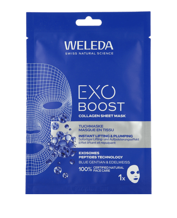 Die Weleda Exo Boost Collagen Tuchmaske mit Blauem Enzian verbindet den Collagen+ Active Complex mit der innovativen Exosome Peptide Technology. Die Maske spendet sofort Feuchtigkeit, polstert die Haut sichtbar auf und schenkt ihr einen strahlenden Glow. Bereits nach der ersten Anwendung wirkt die Haut glatter und gestraffter, Krähenfüße erscheinen gemildert. Die 24-stündige Feuchtigkeitspflege unterstützt ein verfeinertes, jugendlich wirkendes Hautbild und sorgt für neue Frische und Spannkraft.