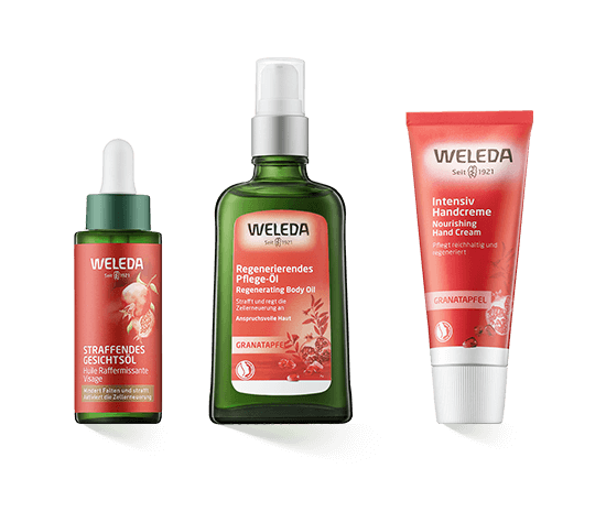 Nicht nur die Haut im Gesicht, sondern am ganzen Körper unterliegt den Veränderungen der Zeit. So gibt es für die Körperpflege noch die Weleda Granatapfel Schönheitsdusche. Sie ist reich an ungesättigten Fettsäuren und wirkt rückfettend mit verschiedenen natürlichen Ölen. Dazu kommt ein fein abgestimmter, leicht orientalischer Duft mit Neroli, Blutorange, Davana und Sandelholz. Im Anschluss kann die Weleda Granatapfel Regenerierende Pflegelotion aufgetragen werden. Sie hat denselben betörenden und femininen Duft. Darüber hinaus enthält sie auch Sheabutter, Aprikosenkernöl und andere wertvolle Pflegestoffe. Es entsteht ein samtweiches Hautgefühl. Abgerundet werden kann die Körperpflege mit dem Weleda Granatapfel 24h Deo Roll-On. Es ist frei von Aluminiumsalzen und besonders sanft zur Haut. Es bietet 24 Stunden zuverlässigen Schutz und hat einen frischen Duft mit Orange und Davana. Hinzu kommen feine Vanillenoten.